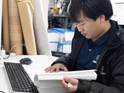 いざ取り組んでみて、いろいろなことを教えてもらいながら仕事を覚えていきました。現場監督の仕事は、入居者の方がお部屋を出るときの解約の立ち合いから、空室になったお部屋の原状回復のための工事の施工計画を策定して、見積もりを立てます。見積もった工事について、管理部の方がオーナー様より承諾を得て、承諾次第工程を組み、工事に取り掛かります。現場に入る職人さんたちに迷惑が掛からないよう部材の発注やスムーズな段取りを行い、工事を完了させる。これが一連の流れです。