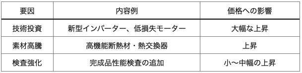 急ぐ必要があり、高性能な断熱材や高効率 コンプレッサー、AI制御などの最新技術導入による開発・生産コストの上昇が避けられません。